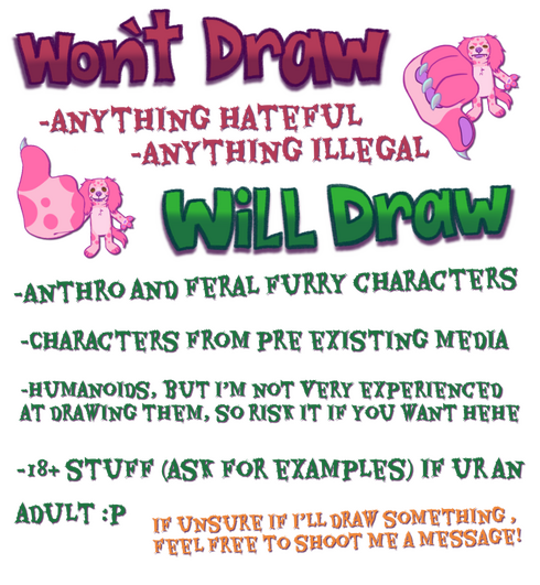 !all prices in cad, not usd!i will only work with digital references, or at least provide a digital colour pallet so there’s no confusion. Using simple doodles to convey your idea for the artwork is very appreciated if you have something specific in mind. Or use a collection of references to explain your idea! :)I will take about a week or two depending on what you requested, and what’s going on in my life. In general I take a lot of time to ensure both me and the customer are happy, and will not be rushedYou pay once I send the sketch, I will continue once I receive the payment. I can also make as many minor changes as you want during the sketch phase, aside from entirely changing the entire illustration. Once the line art has been started there will be no changes to the piece, aside from colour changes. You may make line art requests, eg: thicker lines, thinner lines, or more dramatic line weight, bla bla bla.I don’t do refunds, and if you back out once I’ve finished the sketch i will refuse future commissions from you, so make sure you have the money ready. If you are rude I won’t take any future commissions from you. please be a sensible human being or whatever the hell you are >:3